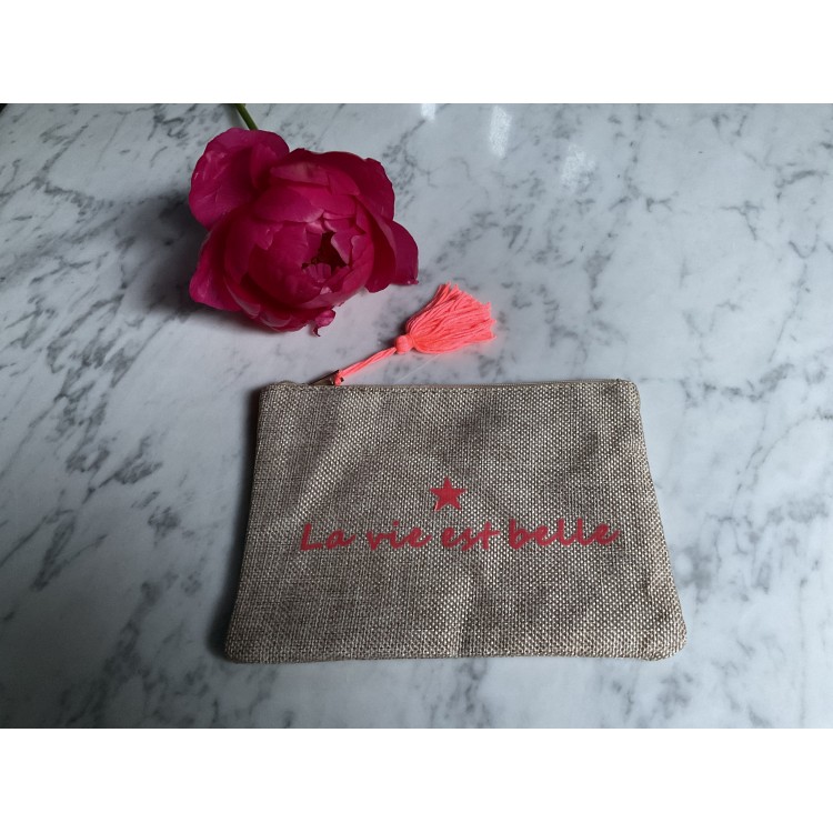 Ces pochettes sont en coton jute avec une fermeture zippée et un joli pompon .